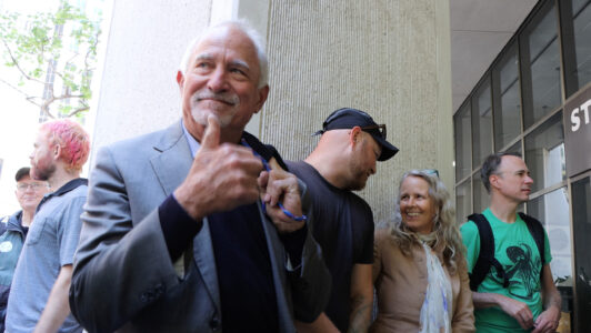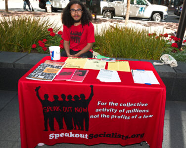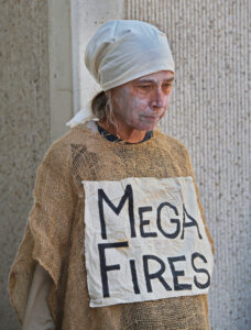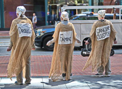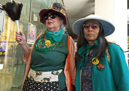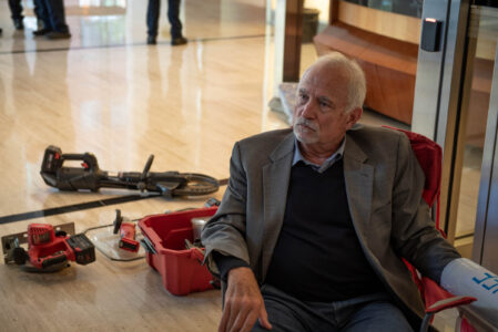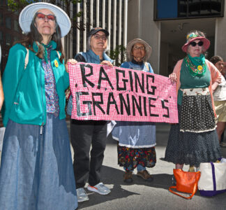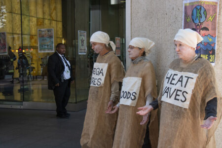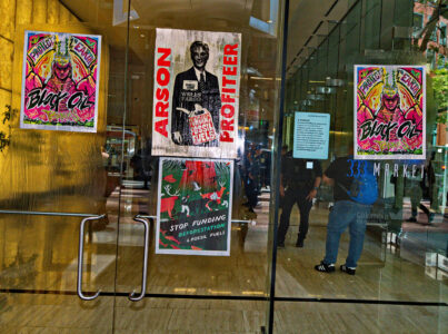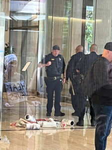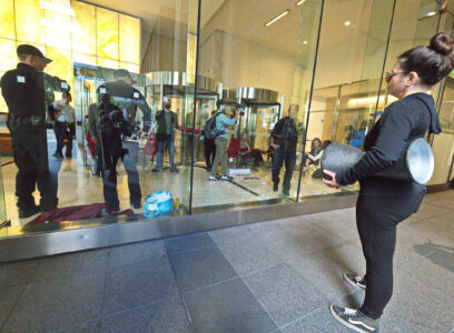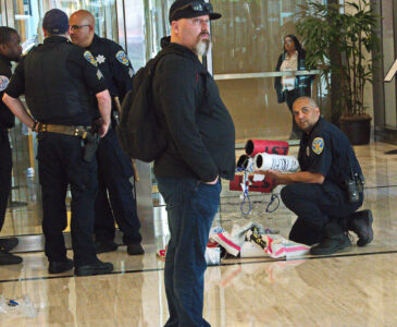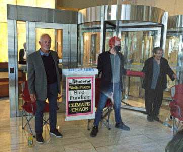 The action was part of a “block party” by local climate action groups to keep the pressure on the bank as it released its quarterly earnings report. The protesters locked down in front of the security gate at the Wells Fargo at 333 Market Street, where they blocked entry and compelled the bank to close. Police called on the San Francisco Fire Department to force the protesters to leave. Hidden from public view by a black tarpaulin, fire fighters cut the lockboxes away from the protesters’ arms. The six – greeted by cheers of encouragement from supporters – were led out of the building to be photographed, fingerprinted and cited by SFPD.