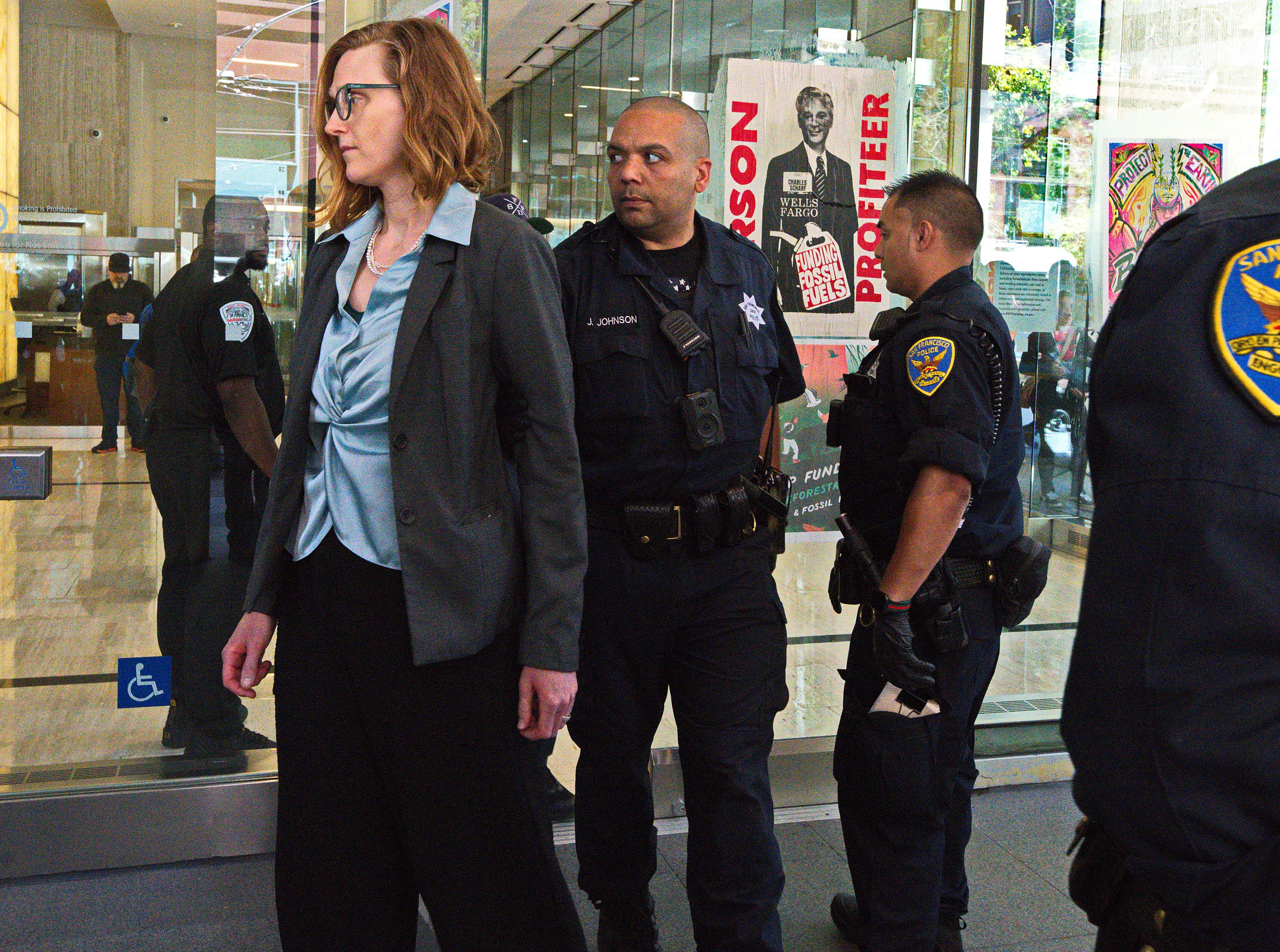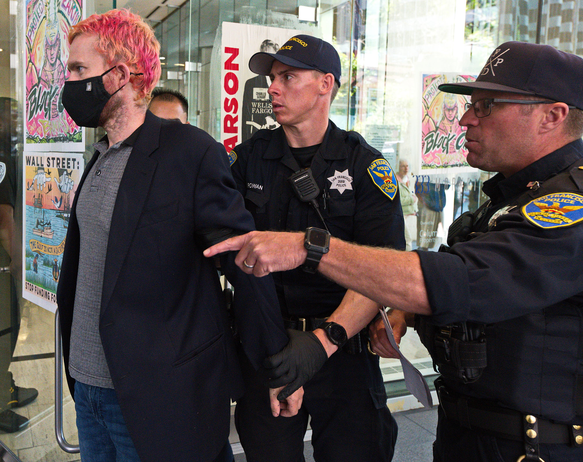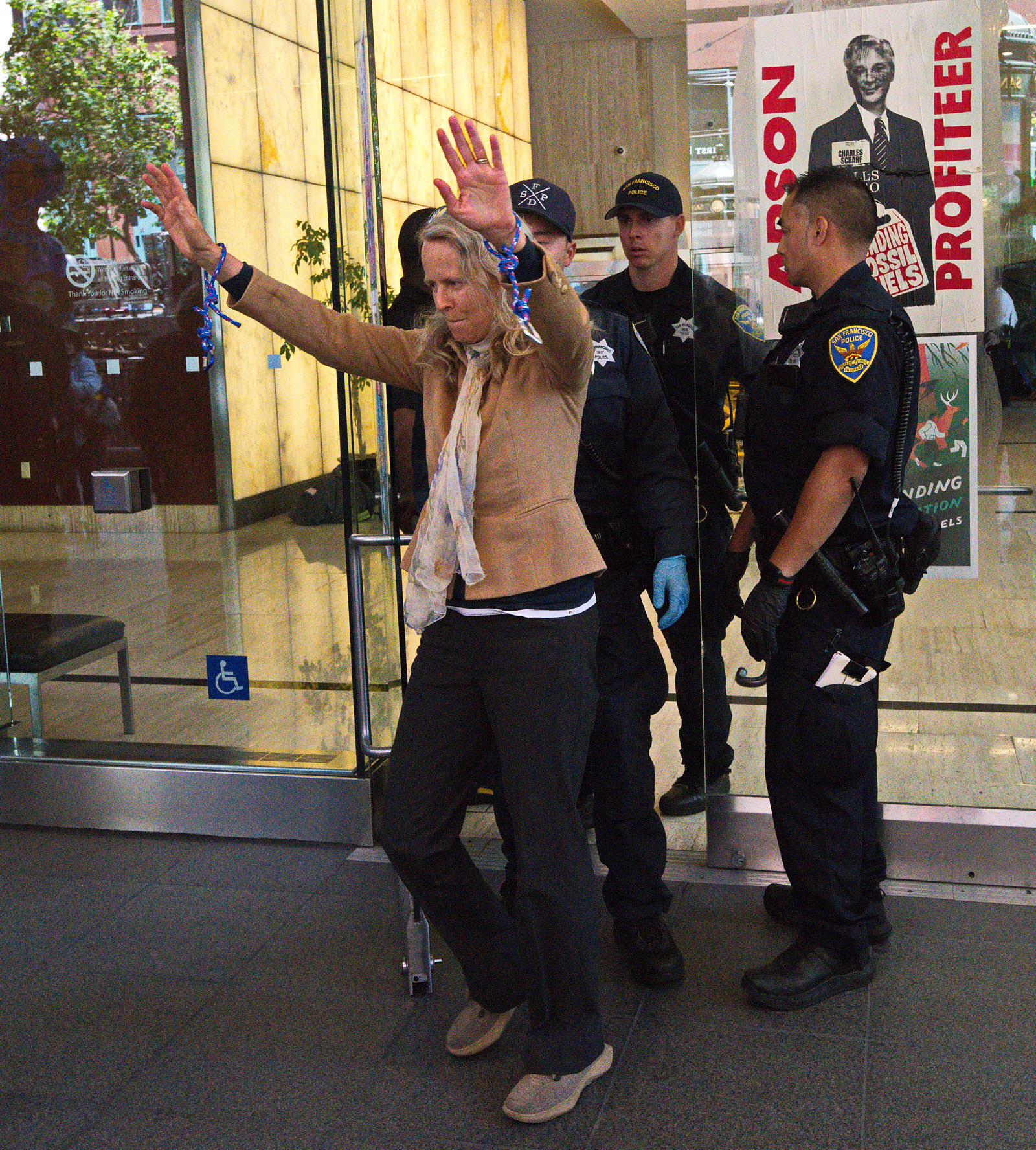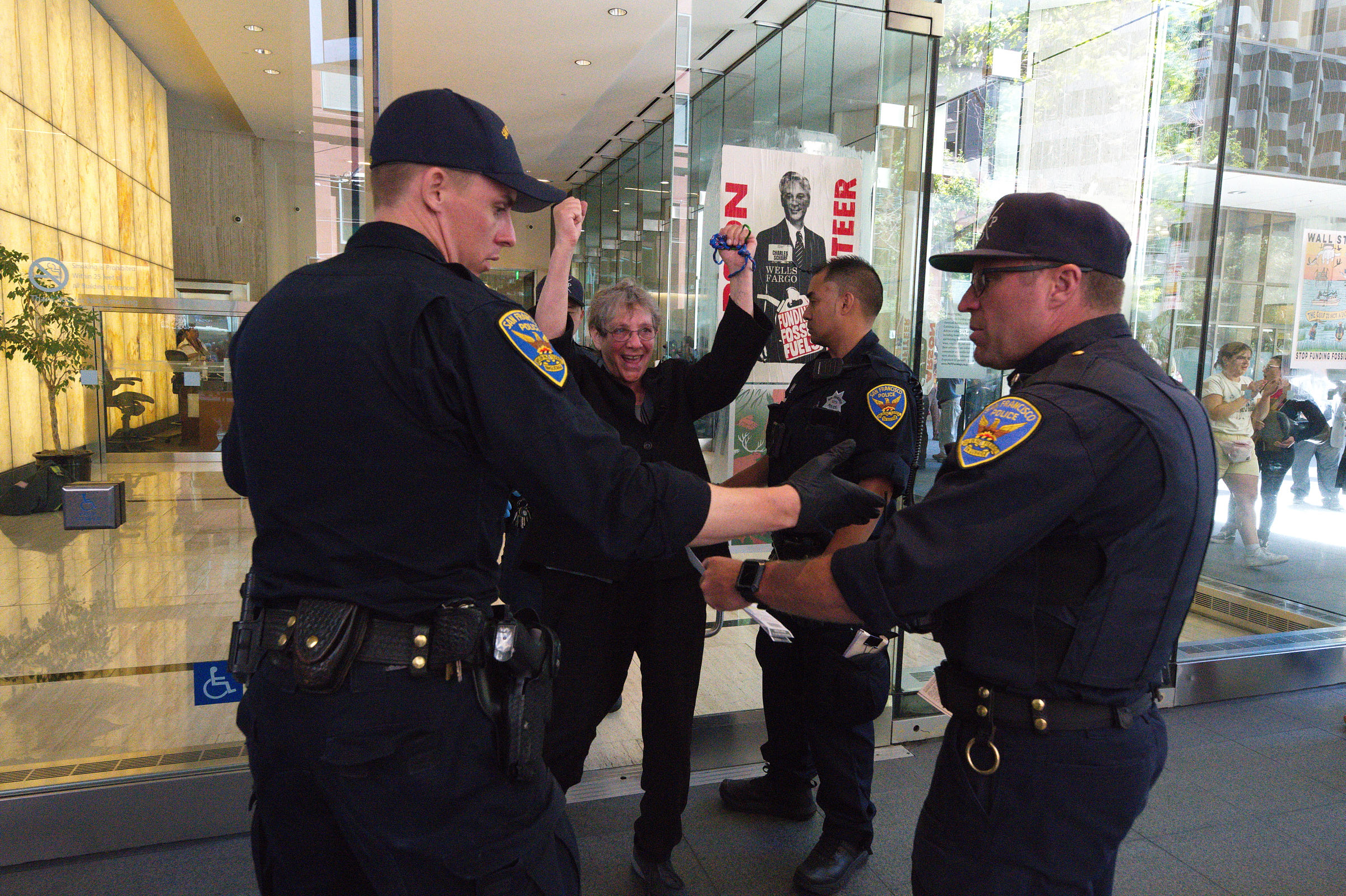 The action was part of a “block party” by local climate action groups to keep the pressure on the bank as it released its quarterly earnings report. The protesters locked down in front of the security gate at the Wells Fargo at 333 Market Street, where they blocked entry and compelled the bank to close. Police called on the San Francisco Fire Department to force the protesters to leave. Hidden from public view by a black tarpaulin, fire fighters cut the lockboxes away from the protesters’ arms. The six – greeted by cheers of encouragement from supporters – were led out of the building to be photographed, fingerprinted and cited by SFPD.