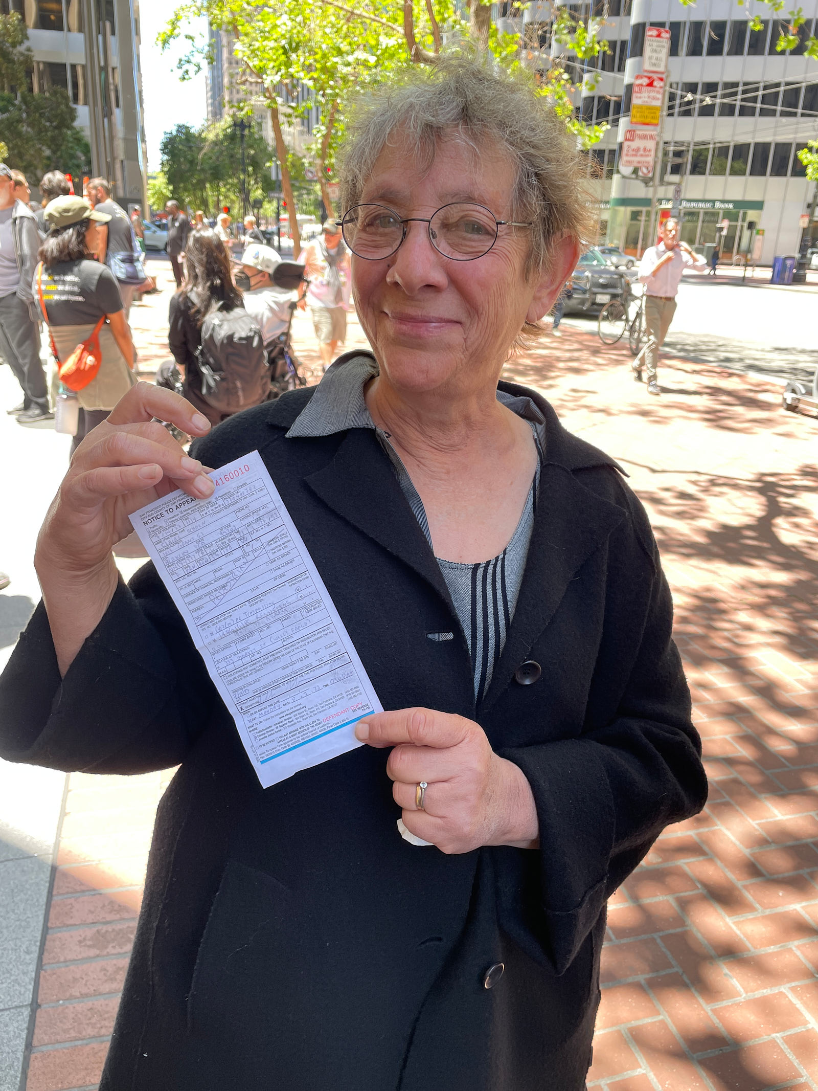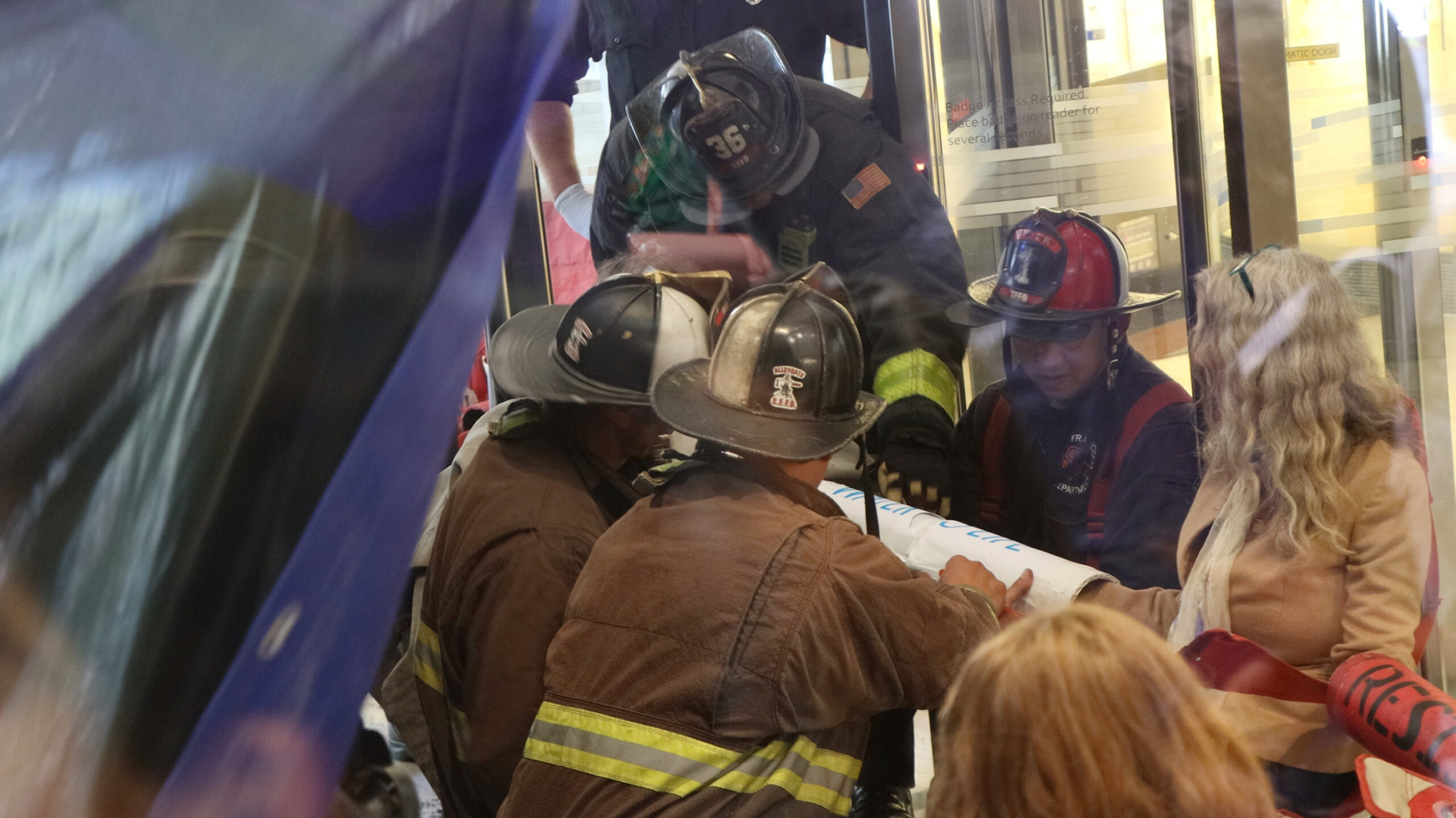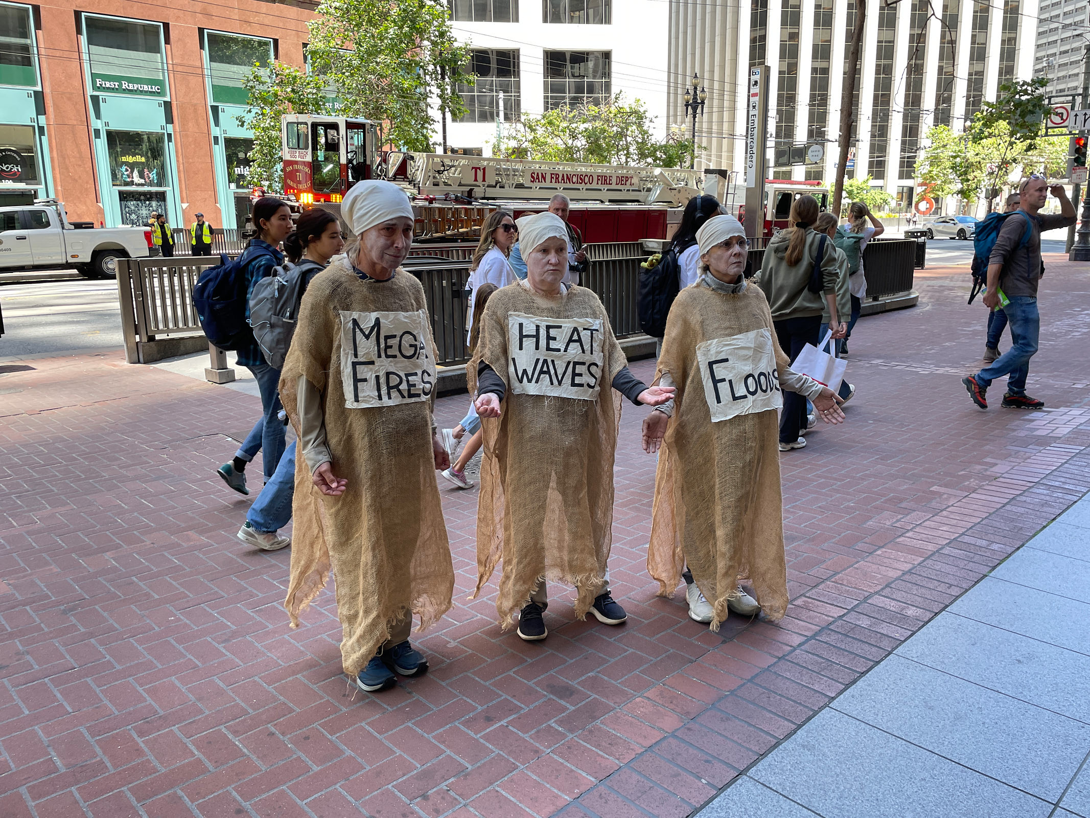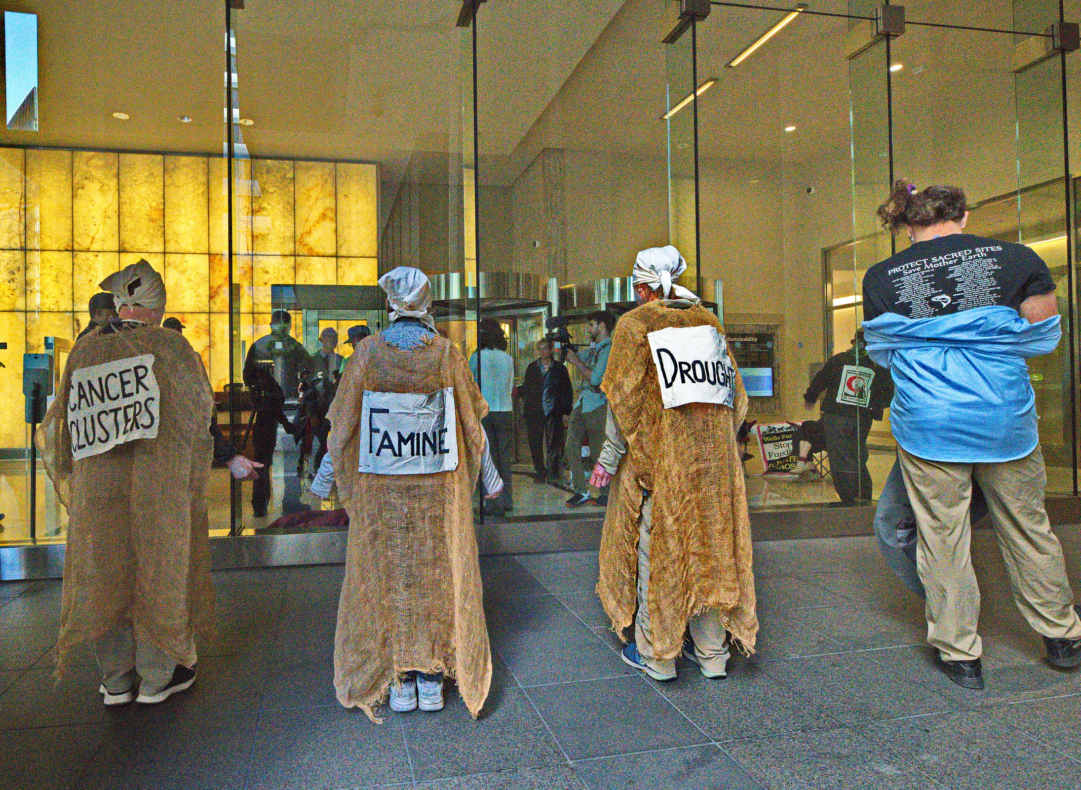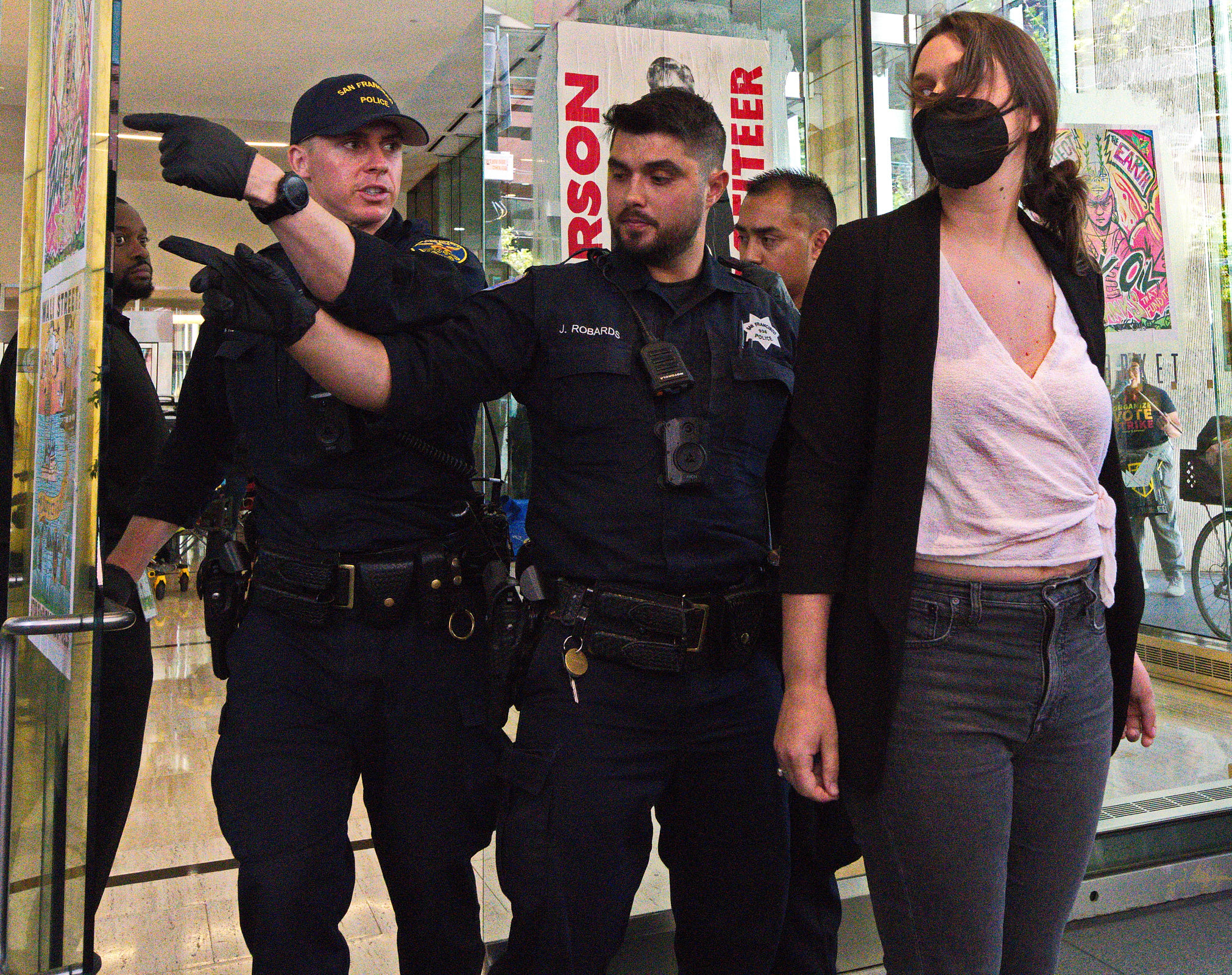The action was part of a “block party” by local climate action groups to keep the pressure on the bank as it released its quarterly earnings report. The protesters locked down in front of the security gate at the Wells Fargo at 333 Market Street, where they blocked entry and compelled the bank to close. Police called on the San Francisco Fire Department to force the protesters to leave. Hidden from public view by a black tarpaulin, fire fighters cut the lockboxes away from the protesters’ arms. The six – greeted by cheers of encouragement from supporters – were led out of the building to be photographed, fingerprinted and cited by SFPD.